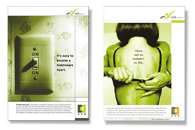 CSK Software AG Entwicklung einer Einführungskampagne für das Produkt X-Gen, einer Software, die als eine Art Übersetzungstool zwischen den unterschiedlichen Systemen der Banken fungiert. Fachhandelsmotive.