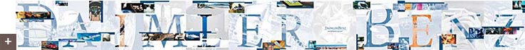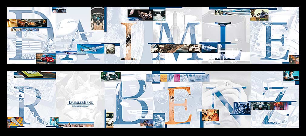 Daimler- Benz AG, Jahreshauptversammlung 1998 (1) Aufgabenstellung: Allen ca. 21.000 anwesenden Aktionären zu vermitteln, dass Daimler Benz für mehr als nur Automobil steht. Der Technologie-Konzern zeigte alle seine Facetten, alles in dem er tätig ist und meist sogar die Technologie-Führerschaft beansprucht. Plakat, offenes Format (30 cm x 220 cm) |