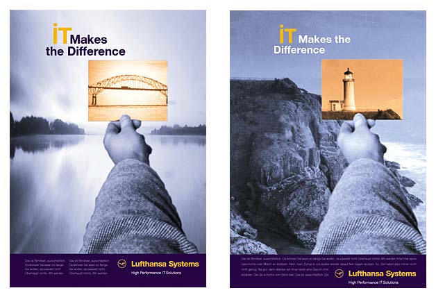 Problem: Zunächst musste der Name Lufthansa mit Leistungen aus dem IT Bereich verknüpft werden. Dann musste den Kunden LH Systems als generellen Problemlöser positioniert werden. Einerseits leicht, weil der Name Lufthansa sehr stark positiv besetzt ist. Andererseits sehr schwierig, weil Lufthansa sehr eindimensional mit Fliegen verknüpft ist. |