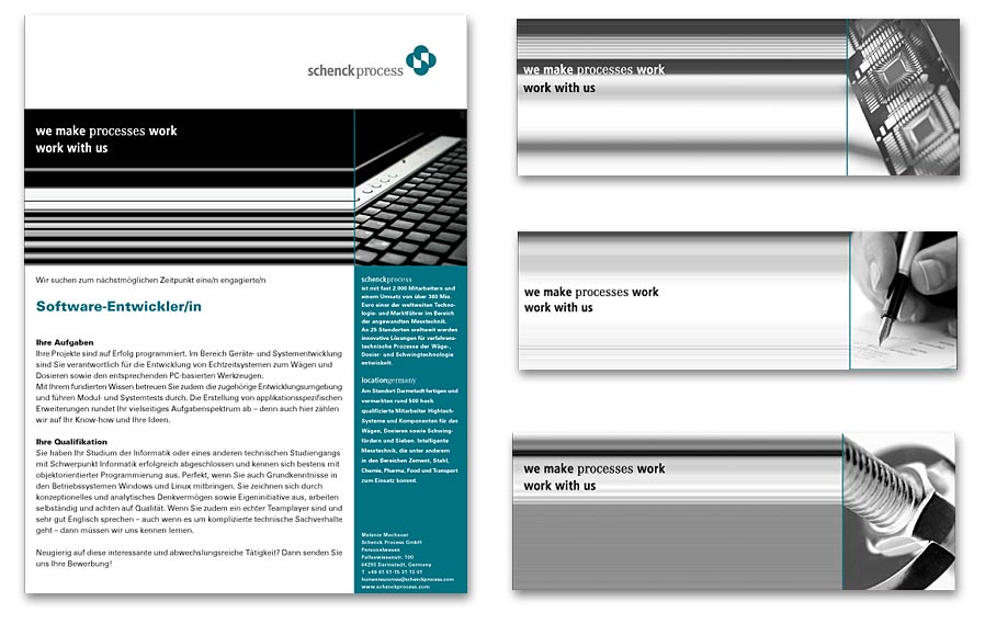 Aufgabenstellung: Das Erscheinungsbild sollte auf klassische Stellenanzeigen übertragen werden. Diese sollten weltweit von den jeweiligen Niederlassungen adaptiert werden. Um den Anzeigen dennoch eine, leicht adaptierbare, gewisse Eigenständikeit zu verleihen, wurde ein besonderes Bildkonzept entwickelt – die dynamisch, gezogenen Kanten.